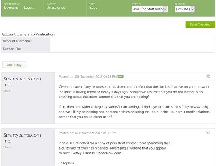 It also turned that this was not an isolated issue - or a new one either. A recent article published by Brian Krebs, one of the comments linked to blog post from 2015, which details almost the exact same issue: same spammer tactic (using domains hosted by/registered with Namecheap to embed content from separate stes via frames/masked redirects), and the exact same run-around from Namecheap's support staff (repeatedly claiming that the spam sites weren't hosted by them, when they clearly were) - the only difference seems to be that those spammers were hawking weight lose products instead of business loans. So that issue has been ongoing for at least 3 years now, and Namecheap is well-aware of it. While the KrebsOnSecurity article wasn't about that particular issue, it did mention NameCheap as one of the top registrars for TLDs (domain name extensions) that are favoured by spammers and spammers; the article also includes a quote from Namecheap's CEO, Richard Kirkendall, where (among other things) he accuses Krebs - a noted tech security ressearcher/journalist - of making "irresponsible assumptions." Kirkendall (or at least someone claiming to be him) then jumped into the article's comments, and didn't exactly inspire confidence in the company's willingness to address spam issues - particularly when he referred to people who oppose spamming as "nazis."